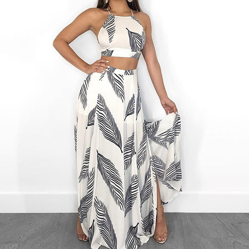 This maxi dress features a vibrant plant print and a halter style that crosses at the navel. The halter neckline accentuates the shoulders and upper body, creating an elegant and sensual silhouette. Its fluid and structured look makes it a striking piece, ideal for those who like to make a statement.